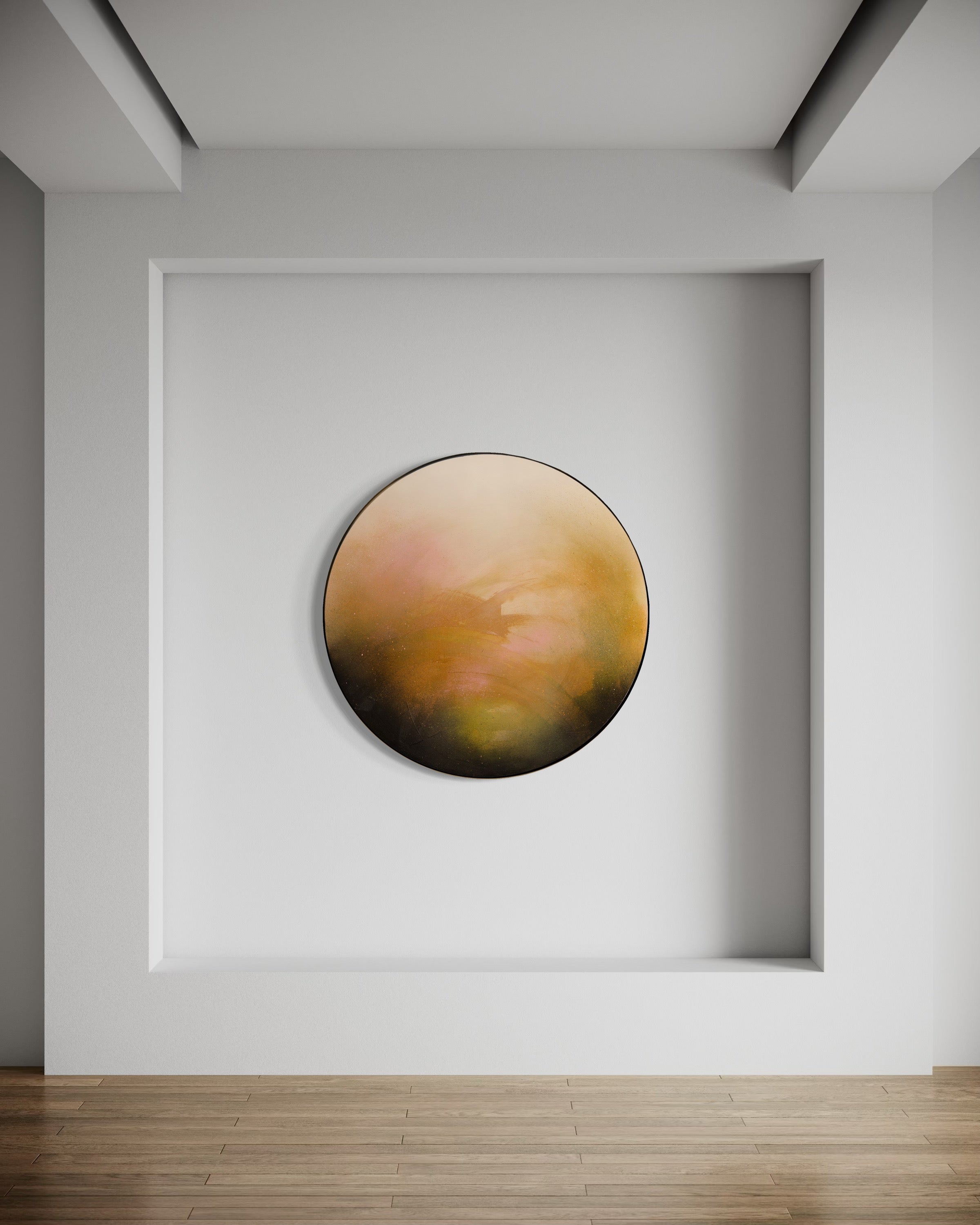 From circular “portals” that radiate harmony to layered abstracts that echo the movement of sound waves, each painting invites the viewer to feel rather than think.